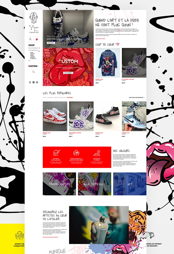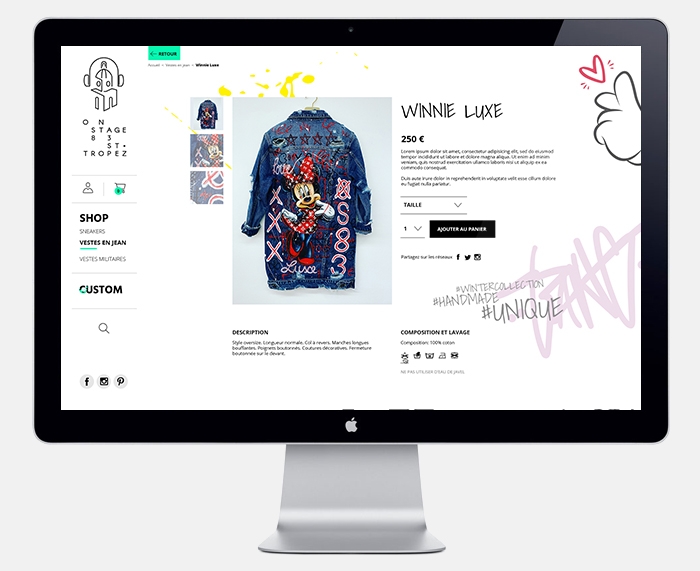 On Stage 83 est une boutique située à Saint Tropez créateur de vêtements de luxe originaux. Nous avons conçu leur site e-commerce et construit leur identité digitale. Le graphisme moderne et décalé est adaptée à la personnalité du client et de leur boutique physique.