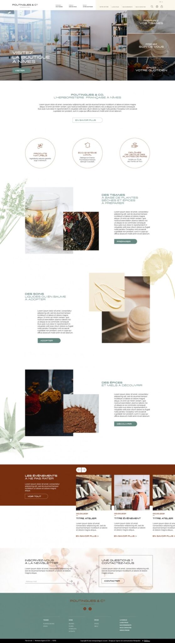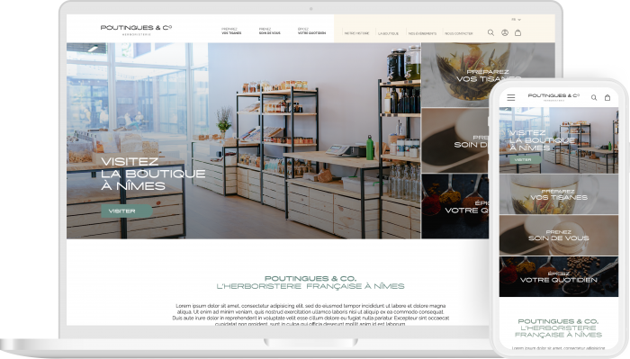 Poutingues & Co. est une boutique et herboristerie nîmoise qui vend des produits naturels efficaces et de qualités. Nous avons conçu leur site e-commerce dont l’objectif est de vendre en ligne mais aussi de promouvoir et augmenter la notoriété de leur boutique physique. Un design travaillé dans la continuité de leur identité : moderne, sobre et lumineuse et s’inscrit dans le temps.