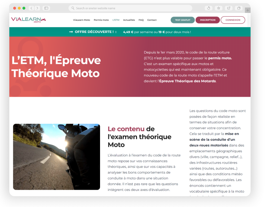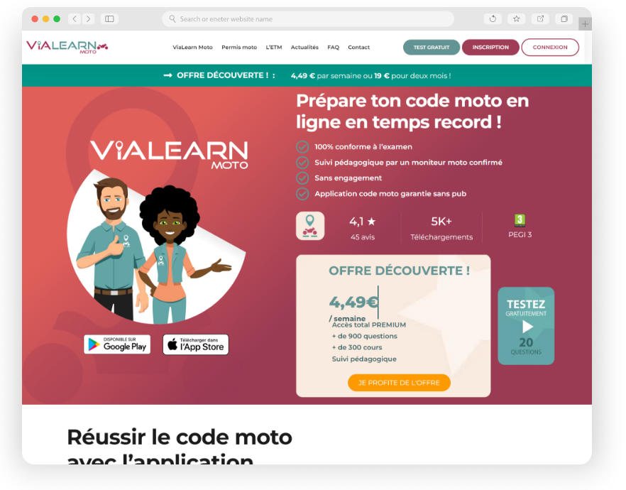 VIALEARN Moto est une application code moto accessible et ludique vous permettant de profiter de cours moto exhaustifs et de tests réalisés par des professionnels de la sécurité routière et de la formation moto.